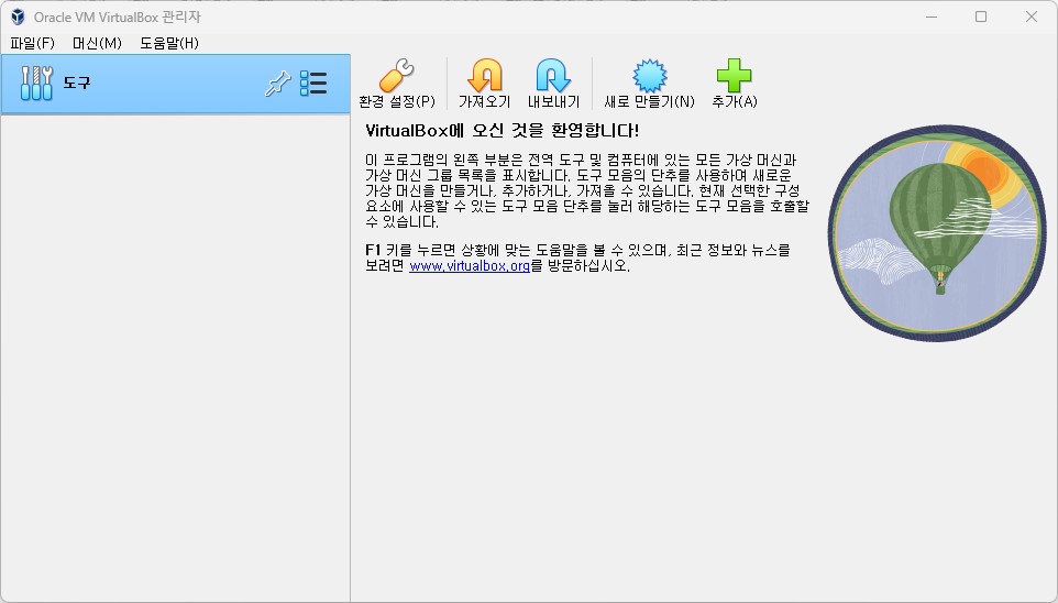VirtualBox 설치 완료되어 [Finish] 버튼을 클릭하면 다음과 같은 VirtualBox 관리자 창이 뜬다.