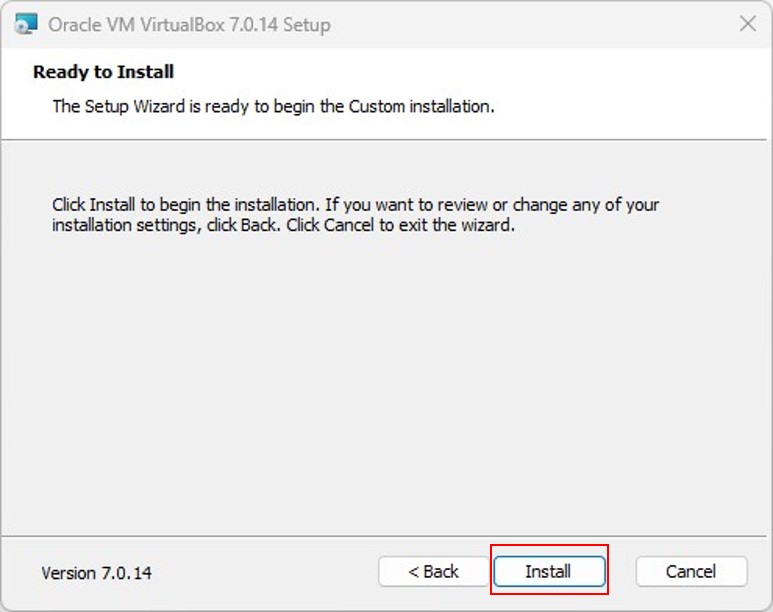 VirtualBox 설치 준비완료 안내로 [Install] 버튼을 클릭하여 설치를 진행한다.