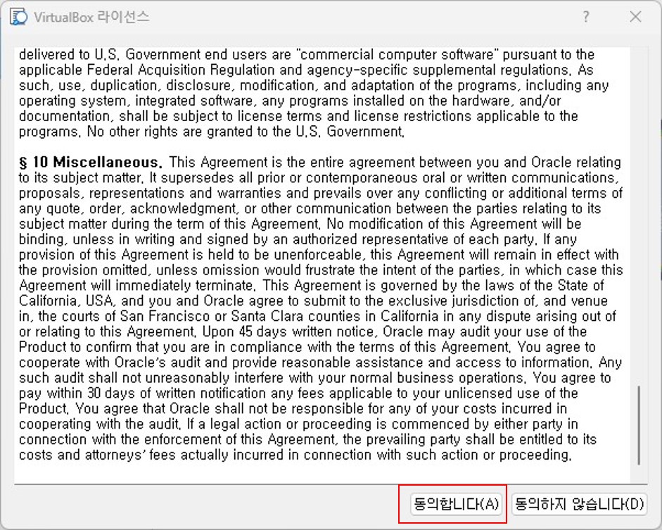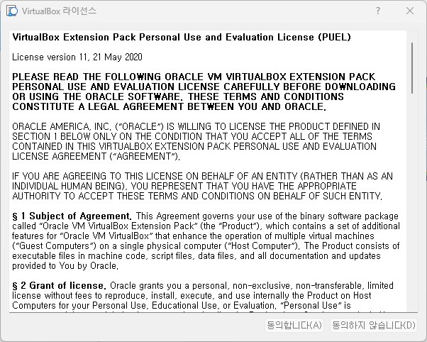 VirtualBox 라이선스 안내가 나오면 우측에 있는 스크롤을 아래로 내려 [동의합니다(A)] 버튼을 클릭하여 VirtualBox Extension Pack 설치를 완료한다.