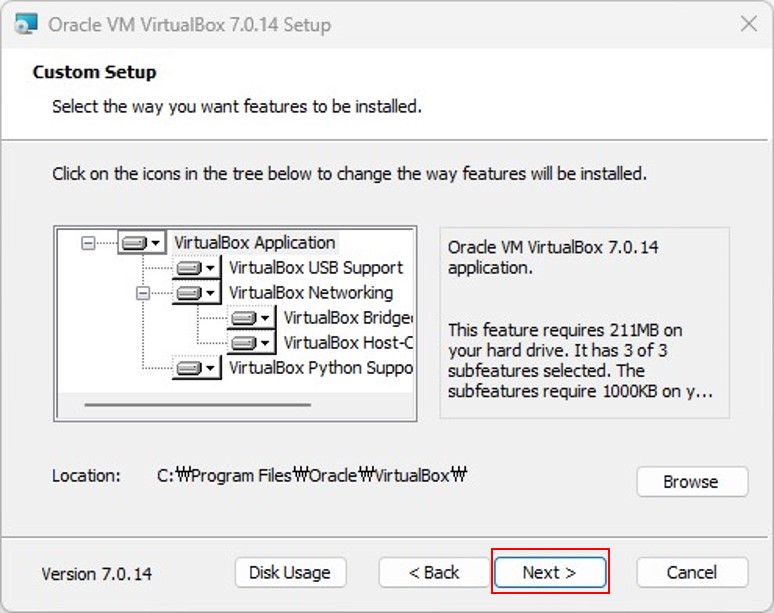 다운로드 받은 VirtualBox 설치파일을 실행하면 VirtualBox 설치 마법사가 실행되며 [Next] 버튼을 클릭하여 VirtualBox 설치를 시작한다.