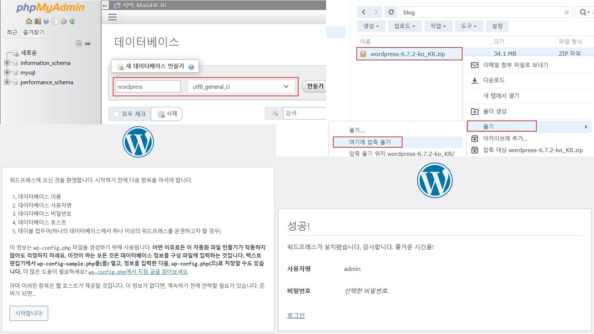 이 글에서는 데이터베이스 생성부터 워드프레스 설치, 데이터베이스 연결, 워드프레스 설정, 설치 확인까지 실습을 통해 알려주겠다.